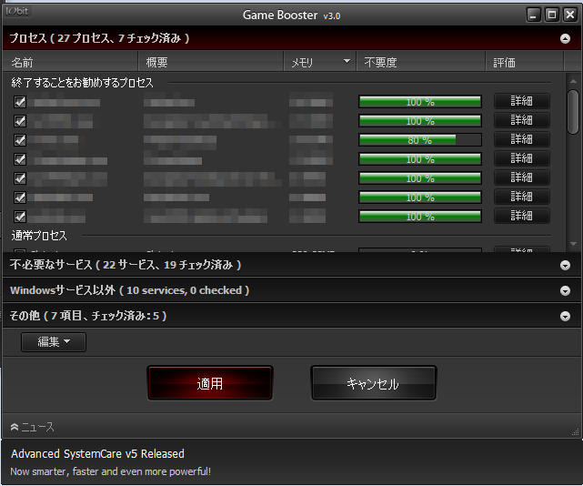 各プロセスの不要度を確認し、不要と思われるプロセスにチェックを入れ適用ボタンをクリック