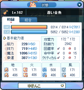 Lv162 ミンストレル 筋力: 172 [177 -5] 体力: 274 [243 +31] 魔力: 481 [471 +10] 幸運: 251 [287 -36] |