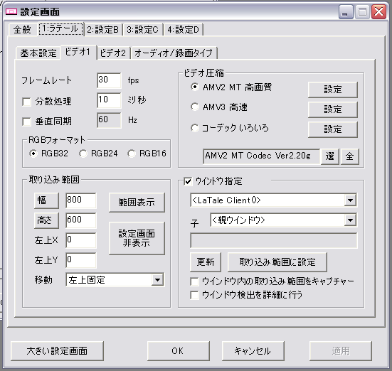 ビデオ1設定画面に戻ってウインドウ指定にチェック、ラテールクライアントを指定、子設定で親ウインドウを指定