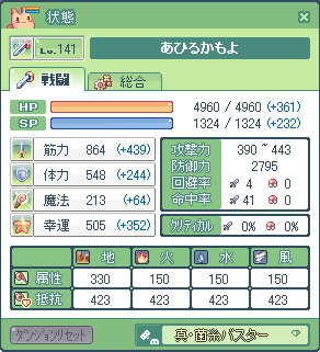 アースは筋力低いのかーあひるはなんでかLVUPする度に筋力7とか6とかばっかり・・・Lv141に上がった時に久々に体力4上がって小躍りしたよ
