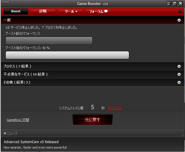 Game中には不要のプロセス、サービスが停止されどの位のパフォーマンスが向上されたかが%で表示されます。